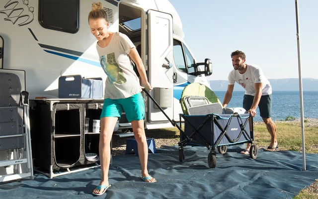 Durch sein kleines Packmaß kann er problemlos überall mit hingenommen werden, der Aufbau ist einfach und erfolgt in wenigen Sekunden. Der Bezug (100 % Polyester) ist sehr robust und wetterbeständig. Die großen Räder ermöglichen einen leichten und komfortablen Transport auf jedem Untergrund.