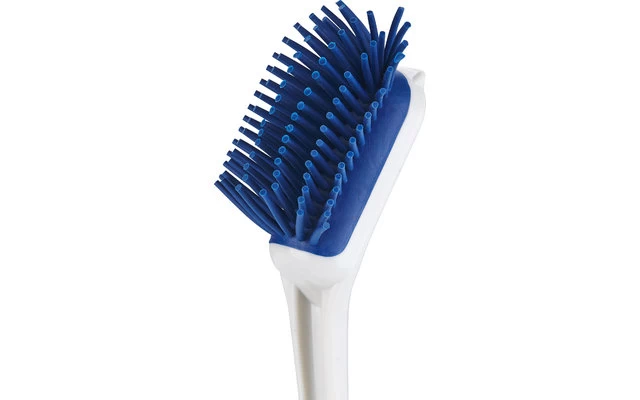 Kompakte ToilettenbĂŒrste mit Silikonborsten und Halterung. Zur Wandmontage.