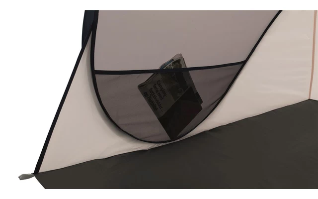 Nach der Entnahme aus der runden Aufbewahrungstasche erfolgt der Aufbau des nach vorne offenen Strandschirms fast von selbst. Er verfĂŒgt ĂŒber einen integrierten Zeltboden aus strapazierfĂ€higem Polyethylen und schĂŒtzt von drei Seiten zuverlĂ€ssig vor Sonne, Wind und Nieselregen, ohne den Blick zu versperren â zum Beispiel, wenn es kleine Kinder zu beaufsichtigen gibt. Abspannseile halten den Strandschirm in Form.