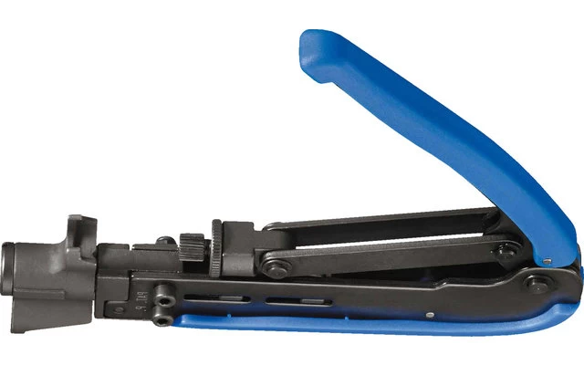 FĂŒr das Anklemmen von Kompressionssteckern an das Koaxialkabel. Wassereintritt und eine schlechte mechanische Verbindung werden somit vermieden. Einmal angeklemmt ist der Stecker mechanisch unlösbar.