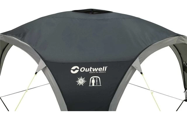 Die Outwell Summer Lounge XL bietet einen vielseitig nutzbaren, frei stehenden Unterschlupf. Die äußerst robuste und stabile Konstruktion zeichnet sich durch große Zugänge und eine bequeme Stehhöhe aus. Dank der Belüftungsöffnung an der Spitze, dem Aufhängepunkt für eine Laterne in der Mitte sowie zwei Netztaschen bietet die Lounge ein Höchstmaß an praktischer Flexibilität. Der verwendete Stoff Outtex 1500 Select Silver bietet einen UV Schutzfaktor von über 50. Um einen größeren geschützten Aufenthaltsbereich zu schaffen, können miteinander kompatible Schutzdächer über eine Regenrinne verbunden werden.
