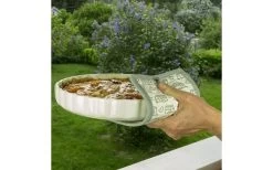 Pufz Topflappen mit zwei verschiedenen Mustern (Wohnwagen/Wohnmobil), einmal weiĂź auf grau und einmal grau auf weiĂź.