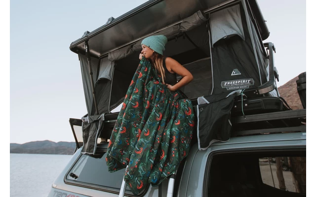 Juno kann auch als Picknickdecke oder wärmende Decke am Lagerfeuer oder in einem kalten Sportstadion verwendet werden. Die leichte, warme und komprimierbare eraLoft Isolierung sowie das weiche, aus gebürstetem Polyester bestehende Futter und der DWR-behandelte Außenbezug aus 30-Denier-Polyester machen die Decke zu unserer kleinsten Funktionsdecke, die überall hin mitgenommen werden kann. Bei einer Größe von 183 x 114 cm und einem Gewicht von 382 g ist die Decke groß genug für die meisten Verwendungen und findet doch Platz in einem Tagesrucksack. Juno ist ideal für alle Outdoor-Unternehmungen. Es weist Schmutz, Sand und Wasser ab, trocknet schnell und ist maschinenwaschbar. Die farbenfrohe Decke lässt sich mithilfe eines Verschlusses sogar um die Schulter tragen.