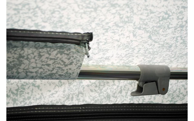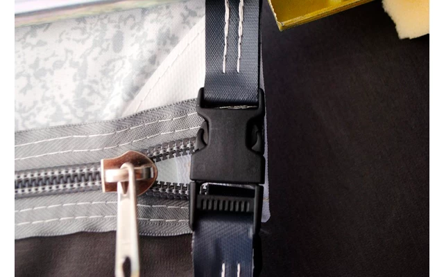 Zum Standardlieferumfang des Patio gehören 2 Seitenwände mit Fenster. Diese sind durch Reißverschlüsse abnehmbar. Powergrips, Sturmgurte und Gardinen für die Seitenwände sind gegen Aufpreis erhältlich. Das Patio wird serienmäßig geliefert mit Keder und 3 Dachhaken zur Befestigung direkt an den Wohnwagen. Die Seitenwände können Sie nicht benützen beim Patio direkt am Wohnwagen.